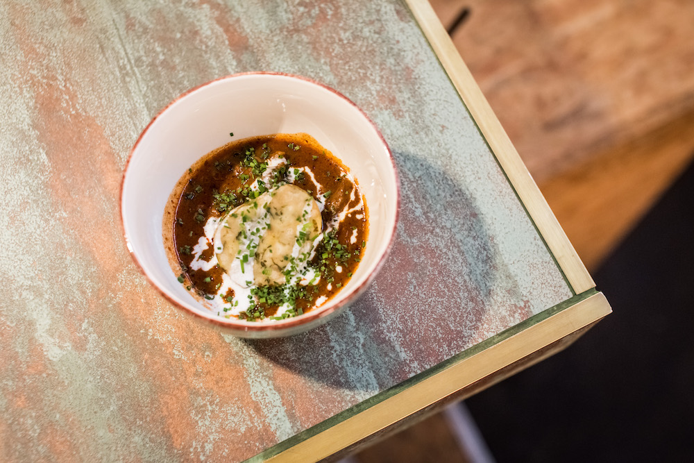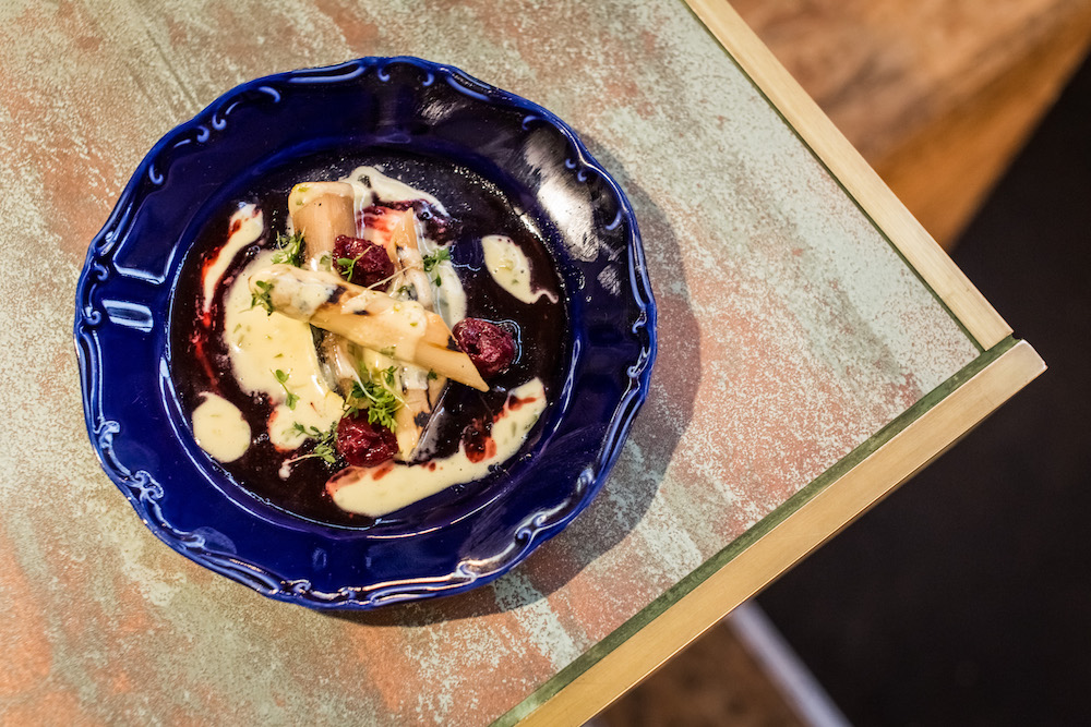 Diese besonderen Gerichte kommen von „Habe die Ehre“. Mozzarella im Kürbiskernmantel, Spargel mit Pfefferkirschen, Rindergulasch nach moderner österreichischen Manier.