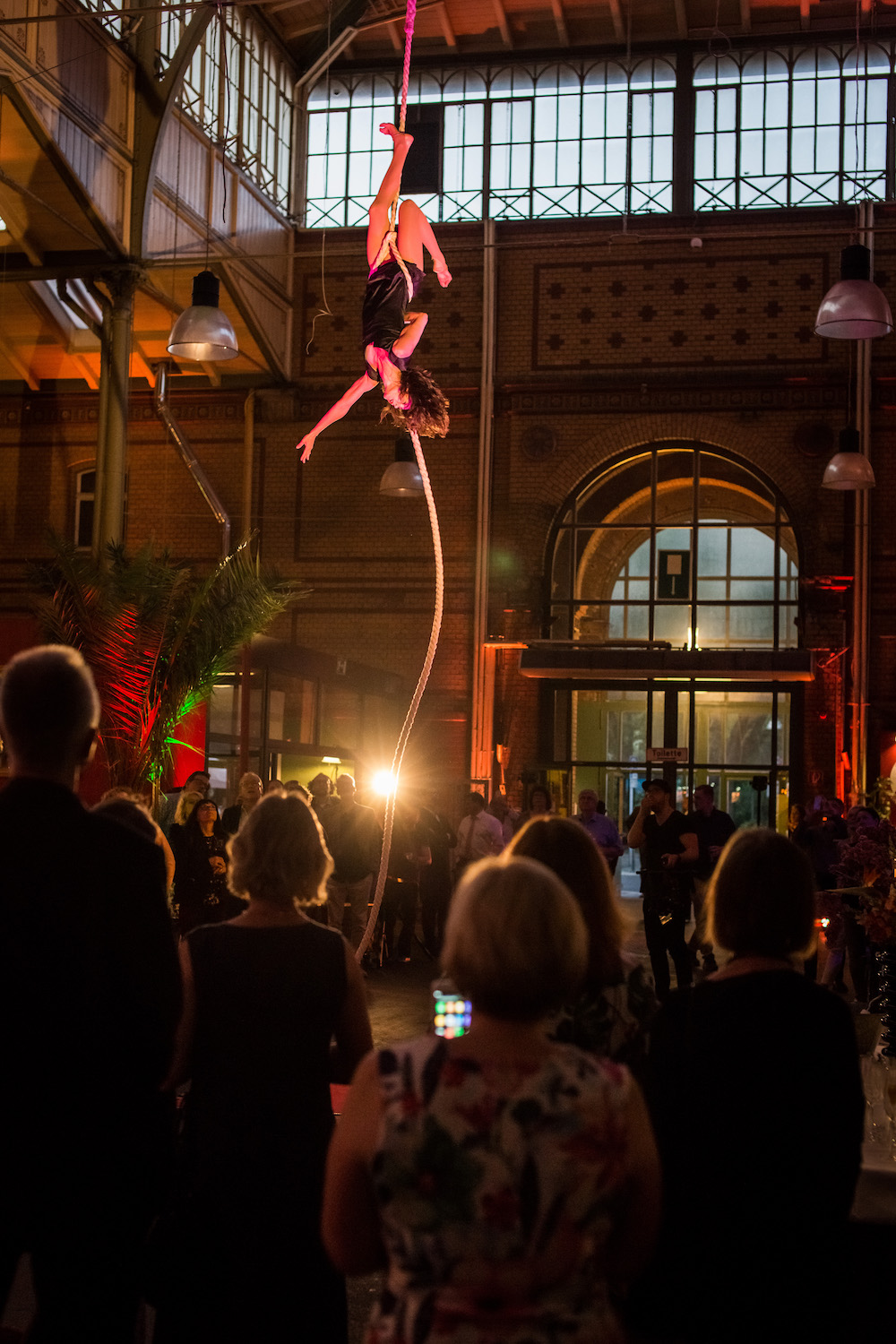 Die Rope Artistin Romy Seibt aus Berlin ist unsere Lieblingsartistin in der Arminius Markthalle. Hier sehen Sie sie bei der DDG Night, die mfe event coach am 11. Mai 2018 für die Deutsche Diabetiker Gesellschaft gestaltet hat. 450 Gäste schlemmten sich durch den Abend und genossen die einzigartige Atmosphäre.